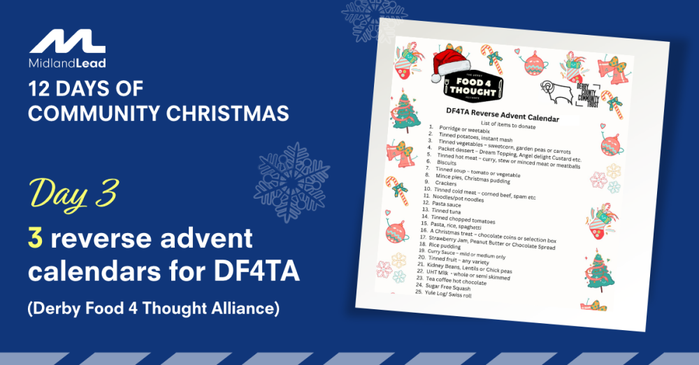 Derby Food 4 Thought Alliance was initially created to respond to the immediate needs of people in Derby at the start of the Covid pandemic in March 2020. Whilst they continue to meet the immediate need of food insecurity, their main focus is to support and signpost those accessing our services to tackle the root causes of their deprivation and poverty. We will donate money towards 3 reverse advent calendars for DF4TA .